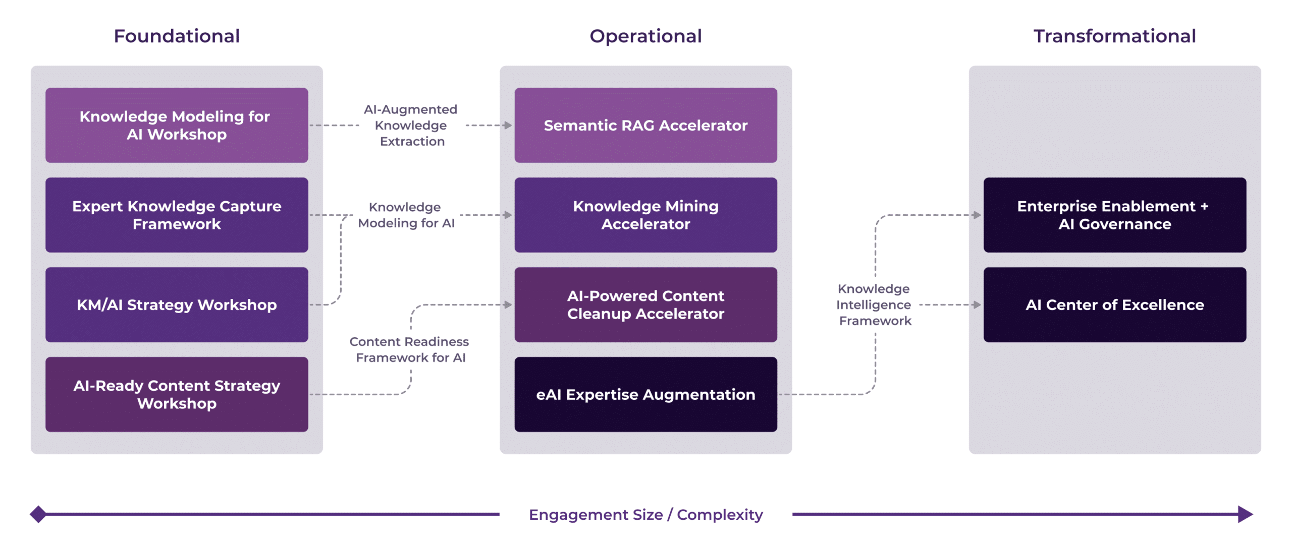 - Content and data readiness framework for AI: Our tested proprietary benchmark and content quality framework was designed and hardened over 20 years of experiences in knowledge and data management. This helps organizations determine AI readiness and creates a guide for ongoing AI adoption and refinement.